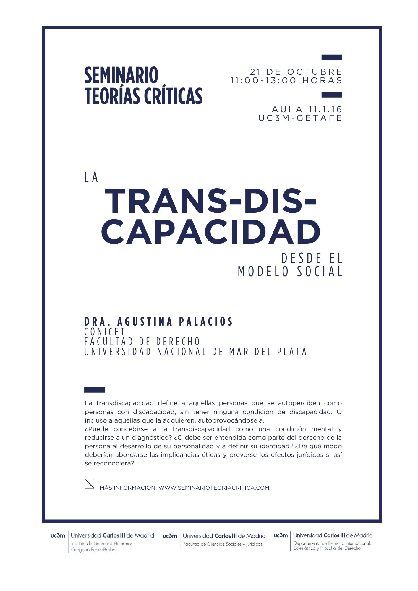La próxima sesión del Seminario de Teorías Críticas se titula “La trans-dis-capacidad desde el modelo social” y estará a cargo de la Dra. Agustina Palacios. La sesión se realizará el martes 21 de octubre, de 11:00 a 13:00 horas, en el aula 11.1.16 del campus Getafe de la Universidad Carlos III de Madrid.